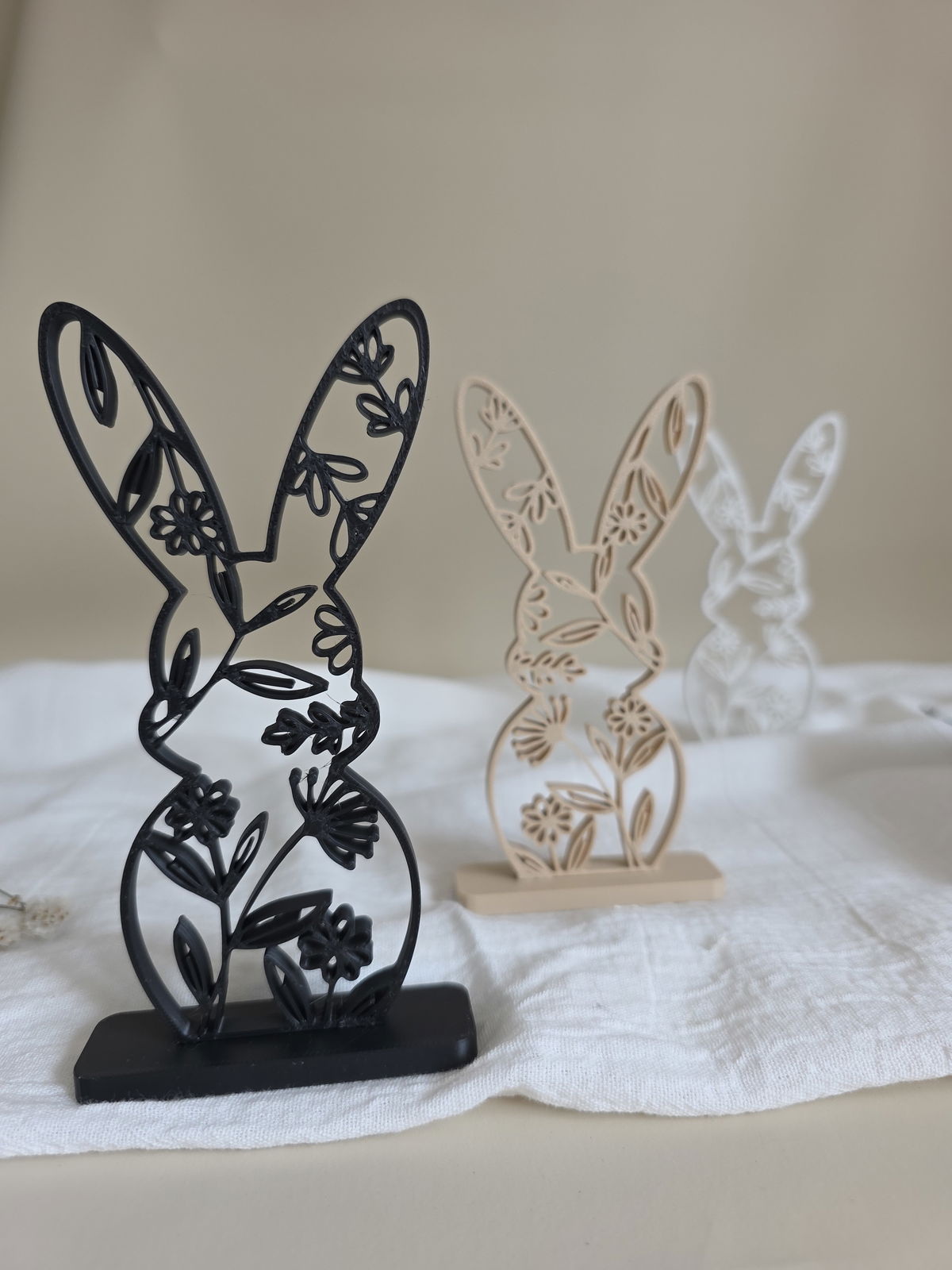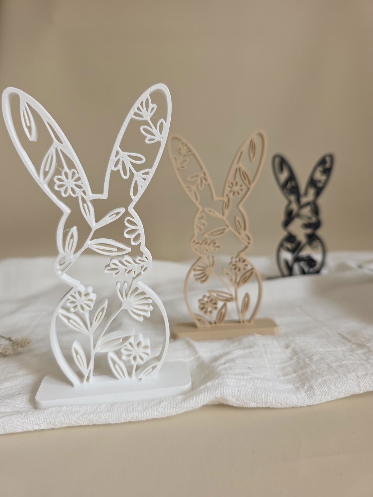 Conejo realizado en impresion 3D, fabricado con PLA (es un poliester termoplastico biodegradable, derivado de fuentes renovables)